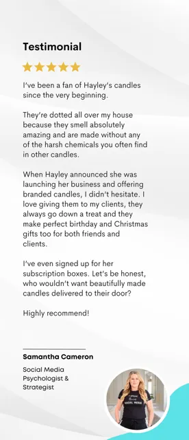 Absolutely love these products especially the candles and the room mists, they fill my house with beautiful long lasting fragrances that everyone comments on. Excellent communication and service with Hayley. Highly recommend.